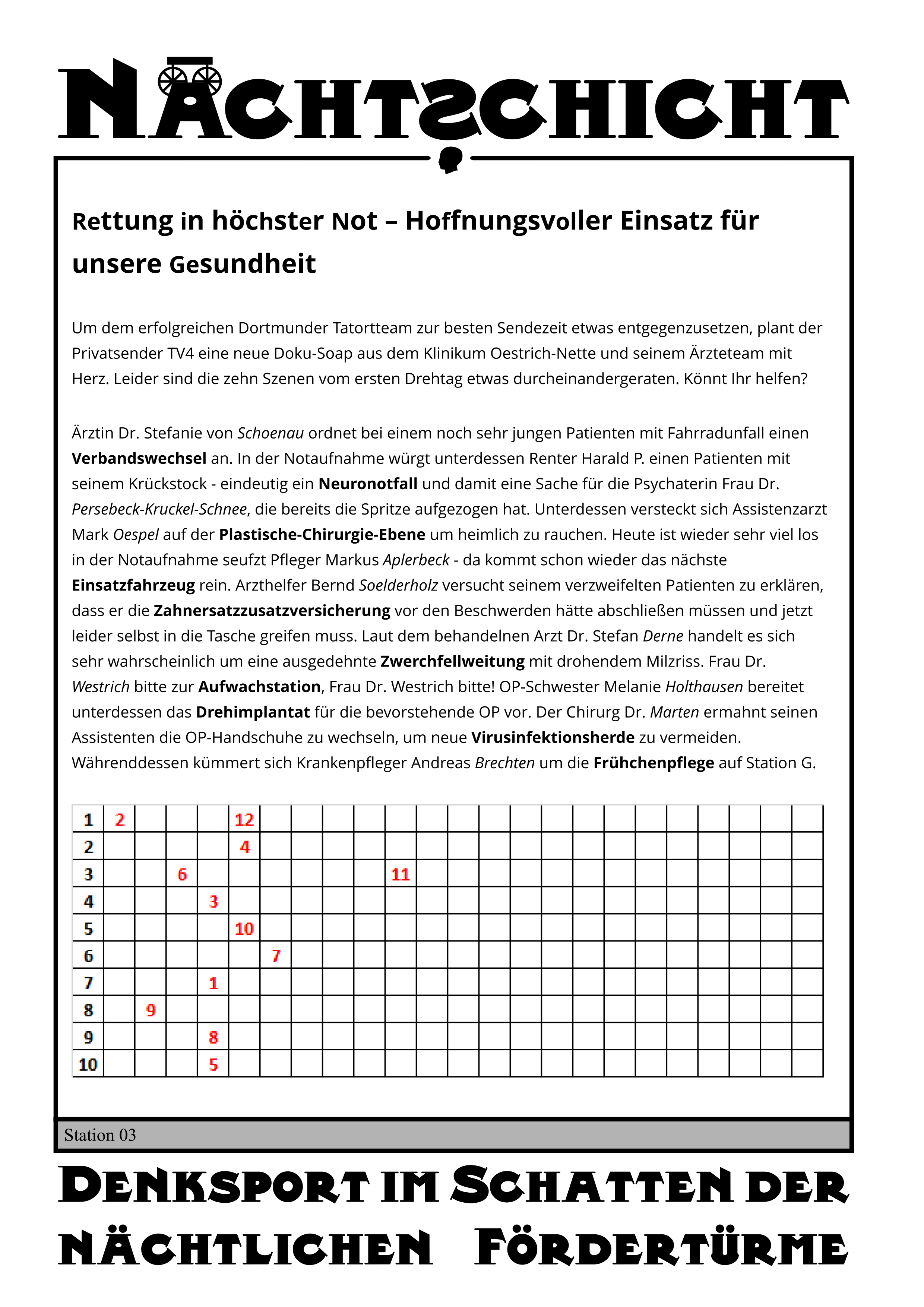 Die fettgedruckten Worte geben die Reihenfolge an (in Ihnen verstecken sich die Zahlen 1-10 - NEUroNotfall = NEUN - Hinweis zu dem Vorgehen ist im Rätseltitel versteckt).
